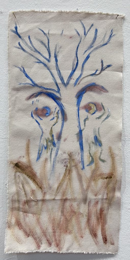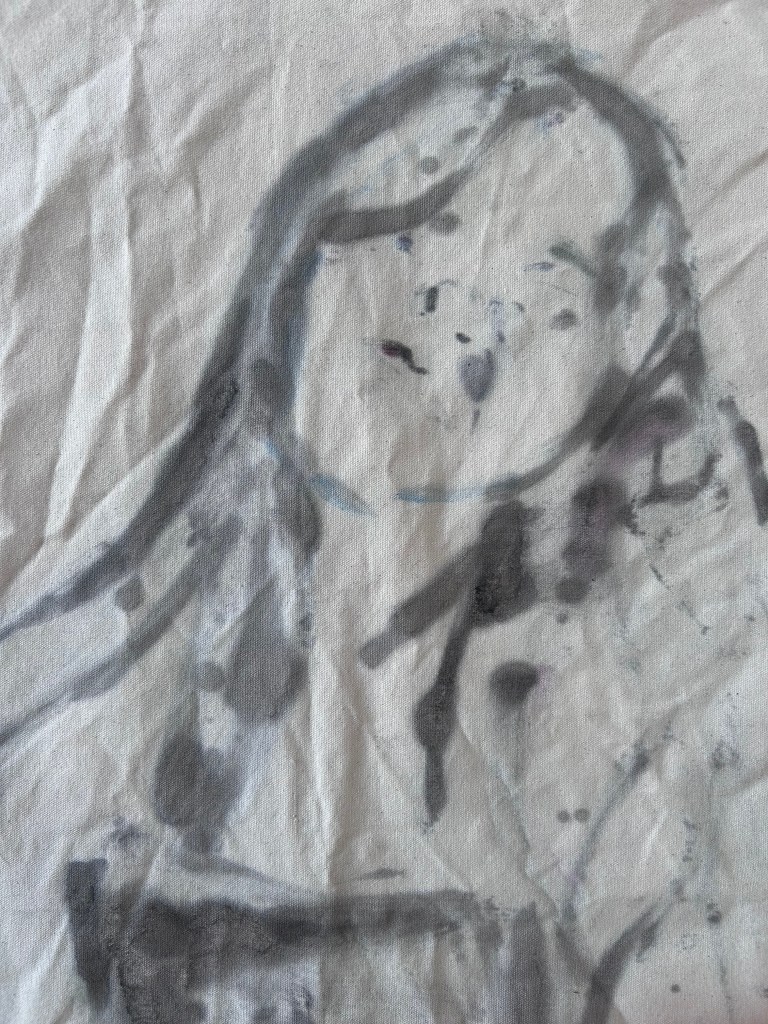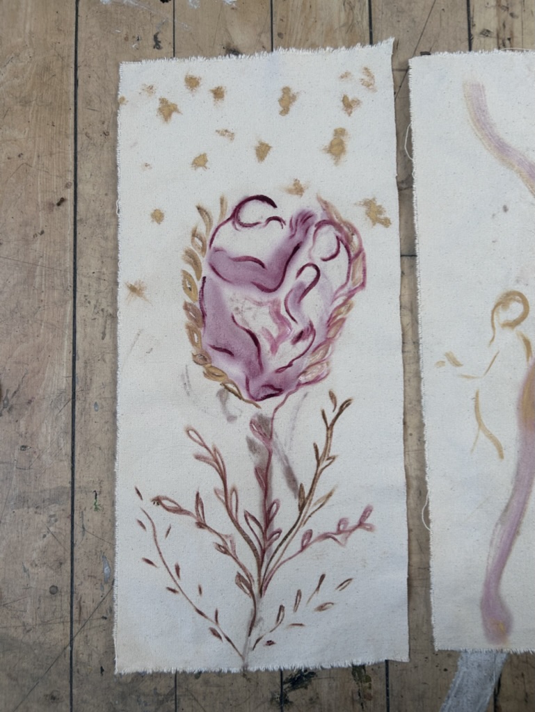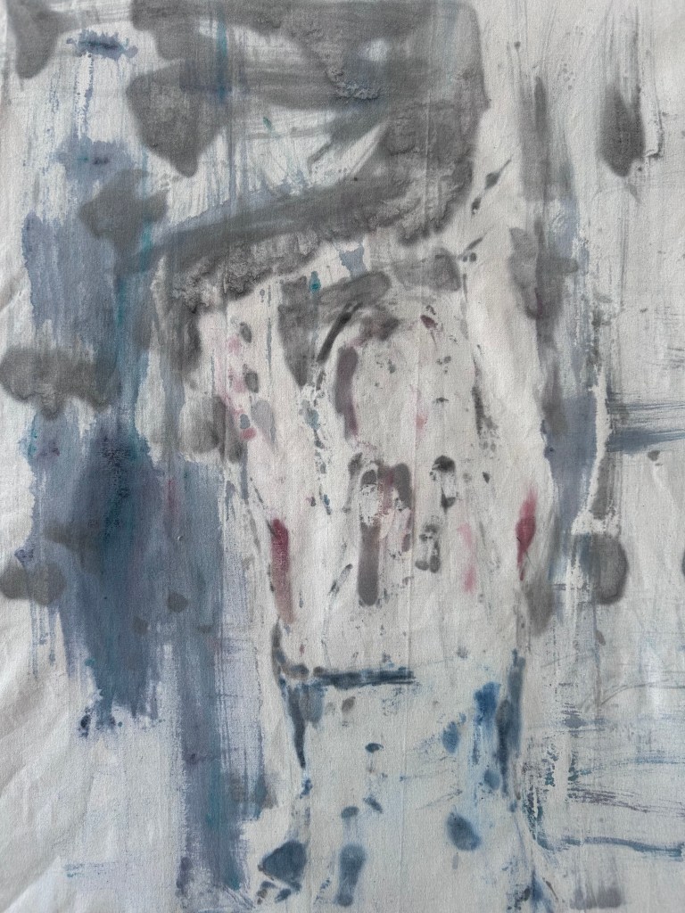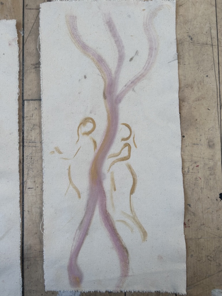 Working on two sides of canvas. Experimenting with ideas of balance, compromise and concealment as some marks remain unseen, while others suggest forms.